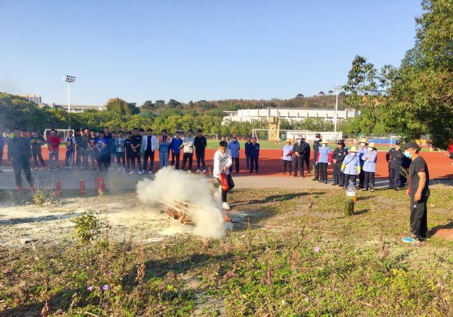 主讲人史明国从“基本消防知识”和“灭火器实操”两个方面进行讲解。他利用实际案例,结合学生在校生活,重点指出学生宿舍用电规范和注意事项,向同学们传授火灾发生时的逃生技巧,并提醒学生在公共场所要熟记安全通道标识,确保发生意外时能够及时有序疏散。史明国现场演示灭火器的使用方法,手把手教授参与培训的学生及后勤保卫人员。随后,两人一组轮流使用灭火器进行灭火。“我原来没有接触过灭火器的使用,第一次亲自动手灭火,内心很激动。通过这次活动我学习了许多消防安全的知识和技能,希望学校之后也可以多举办类似的活动。”运动训练一班的学生刘建波说道。