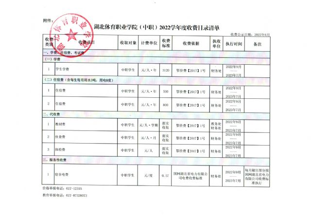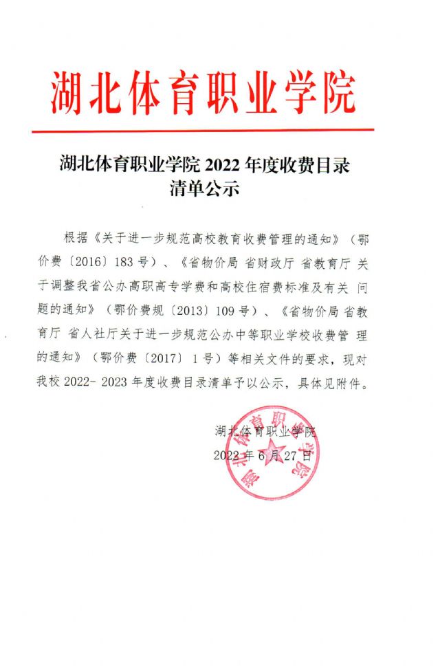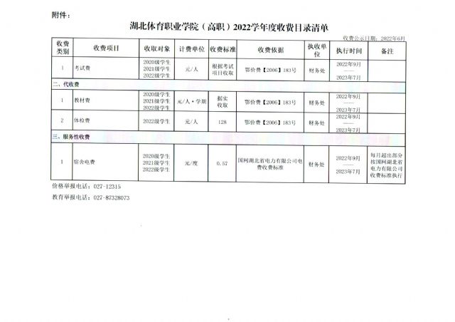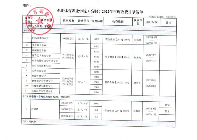 湖北体育职业学院2022年度收费目录清单公示