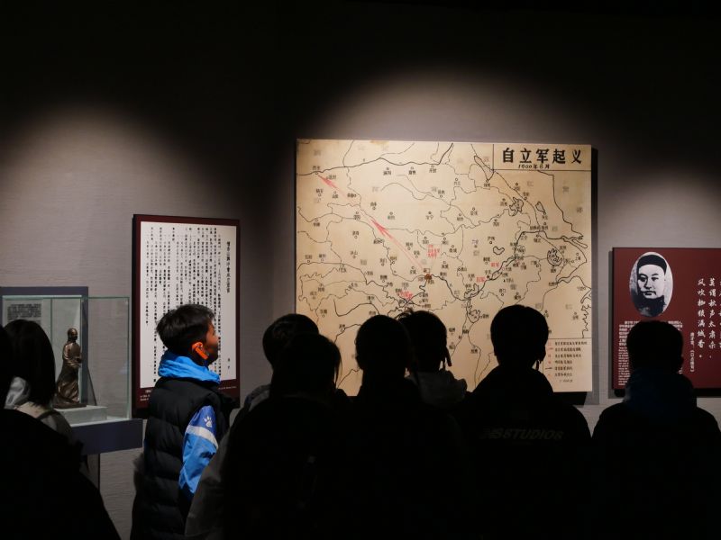 在纪念馆,全体师生在馆前广场列队合影,青砖红瓦的纪念馆与同学们的青春面庞相映,定格下铭记红色记忆的重要瞬间。活动以分组形式开展,三位专业讲解员带队,系统讲解武昌起义的历史背景、经过与伟大意义。同学们专注观摩馆内历史文物、珍贵照片史料,不时拍照记录、交流讨论,还在师生互动中自发将历史事件与爱国主义精神、青年责任相联结,深入思考“辛亥精神”的时代价值,展现出良好精神风貌与求知热情。