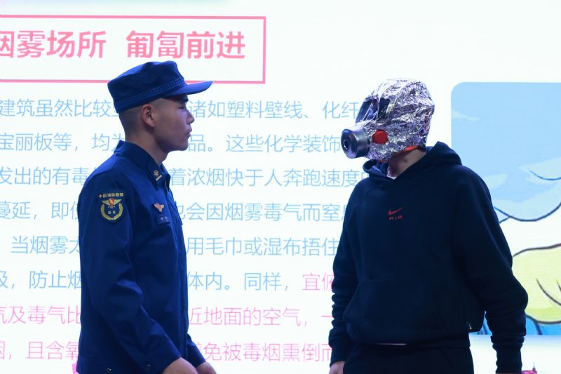 李政教官结合多起真实案例,针对校园宿舍电器短路、实验室试剂起火、食堂油烟管道火灾等常见场景,教同学们区分A、B、C、D等不同类型火灾的特征,并对应匹配正确的灭火方式,让抽象的知识变得可感可用。在至关重要的火场逃生环节,他反复强调“熟悉环境、暗记出口”“湿毛巾捂鼻、过滤烟毒”“烟雾区域、低姿匍匐”等实用技巧,同时以过往事故为警示,明确禁止“乘坐电梯逃生”“逃生后折返取财物”两大高危行为,通过“技巧+禁忌”的双重讲解,提升学生面对火情时的自救互救能力。