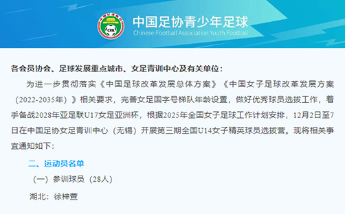 本网讯(文 紫君 图 夏欣)近日,中国足球协会发布2025年全国第三期U14女子精英球员选拔营通知,我校女足队员徐梓萱凭借出众实力成功入选,12月2日至7日参与中国足协女足青训中心(无锡)的集训。此次选拔营是落实国家女足改革发展方案、备战2028年亚足联U17女足亚洲杯的重要举措,徐梓萱的入选不仅是个人实力的印证,更是我校女足青训成果的生动展现,为校园足球发展注入了强劲动力。