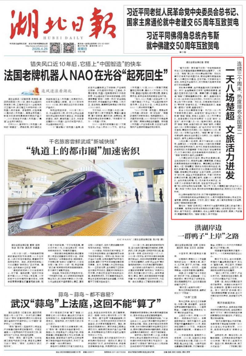 湖北日报头版报道:连续三个周末,热度排名全国第二 | 一天八场楚超 文旅活力迸发